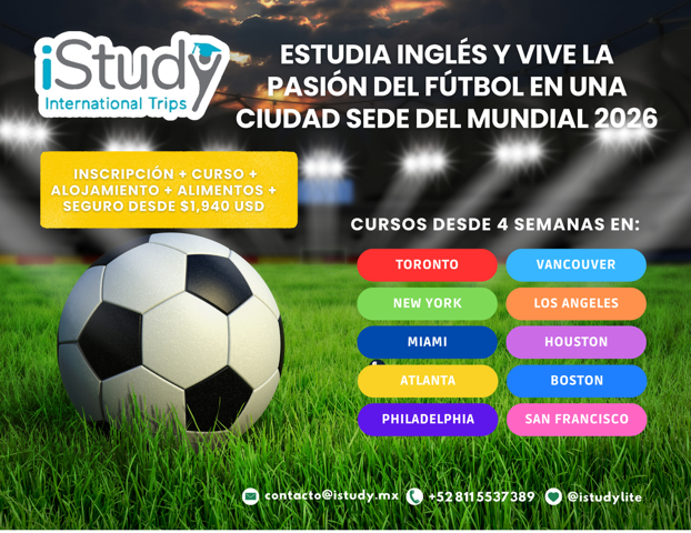 Pensando en esto, iStudy, una empresa especializada en movilidad académica internacional con más de 16 años de experiencia apoyando a jovenes de todo Latinoamérica a estudiar en el extranjero, ha diseñado programas que permiten estudiar inglés en algunas de las ciudades sede del Mundial de Futbol 2026. Estos programas combinan clases de idioma, alojamiento, actividades culturales y acompañamiento antes y durante el viaje, con el objetivo de vivir el Mundial sin perder el enfoque académico.